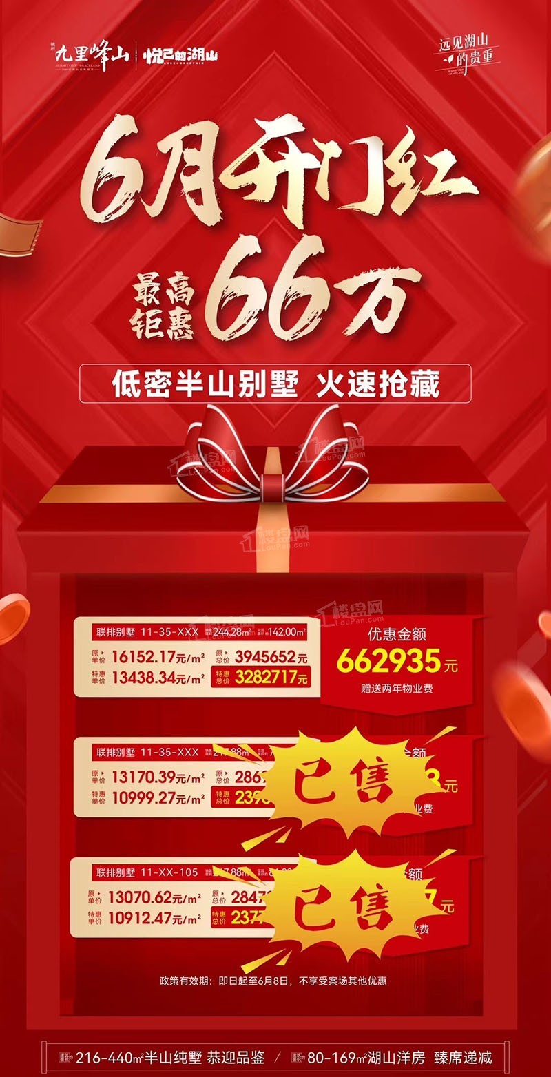 【赣州九里峰山】十一期别墅两套特价房,送1年物业费,总价约244万起~3月20日加推11期9到12号楼双拼别墅,建面约436-440㎡,均价14000元/㎡!十一期悦几的湖山2023年1月开盘!3月19日十期一尺山居盛大开盘,建面约213-298㎡半山美墅,有天有地有院子,均价12500-15000元/㎡;建面约80-169㎡美学洋房,户户瞰山揽景,均价9300元/㎡。九期洋房建面115-145㎡,均价9000元/㎡,别墅建面约220-260平,均价13500元/㎡。十期雲庐建筑面积约213-298㎡半山别院别墅,均价12000到17000元/㎡;洋房建面约115-145平,均价9200元/㎡。项目总占地3600亩,容积率低至1.05,营造墅区宽域雅静,为赣州生态人居大盘,其中体育休闲设施占地2500亩。【赣州九里峰山售楼部位置】项目位于章江新区南侧,蓉江新区东侧,旁边拥有近2万公顷峰山国家森林公园,内部有章贡区第二十一保育院、厚德外国语学校。小区配套: 2000亩生态绿地、20000平米度假酒店、10000㎡风情商业街、6000㎡会所、1500㎡泰式风情泳池、800亩山顶公园、社区邻里中心 、邻里食堂、健身会所、颐养心舍、科教学堂、耕心书屋、康养中心等。赣州规模大、配套全、品质高 、环境优美、空气清新的湖山大城,实现集娱乐、游乐、运动、休闲、度假、康养、商业、教育、医疗于一体的全功能社区。欢迎大家关注抖音号(赣州楼盘网),公众号、今日头条(赣州楼市圈),解锁更多赣州房产、赣州新房、赣州房价、赣州土拍、赣州城市建设密码!九里峰山在售参考价格:参考均价9200元/㎡楼盘地址:站北区峰山国家森林公园旁 楼盘电话:400-818-0066 转 079695来电或报名可享受团购优惠<form enctype="multipart/form-data" action=m/group_buy/Groupbuymsg" method="post">姓名:手机: 我已阅读并同意 《楼盘网用户服务协议》