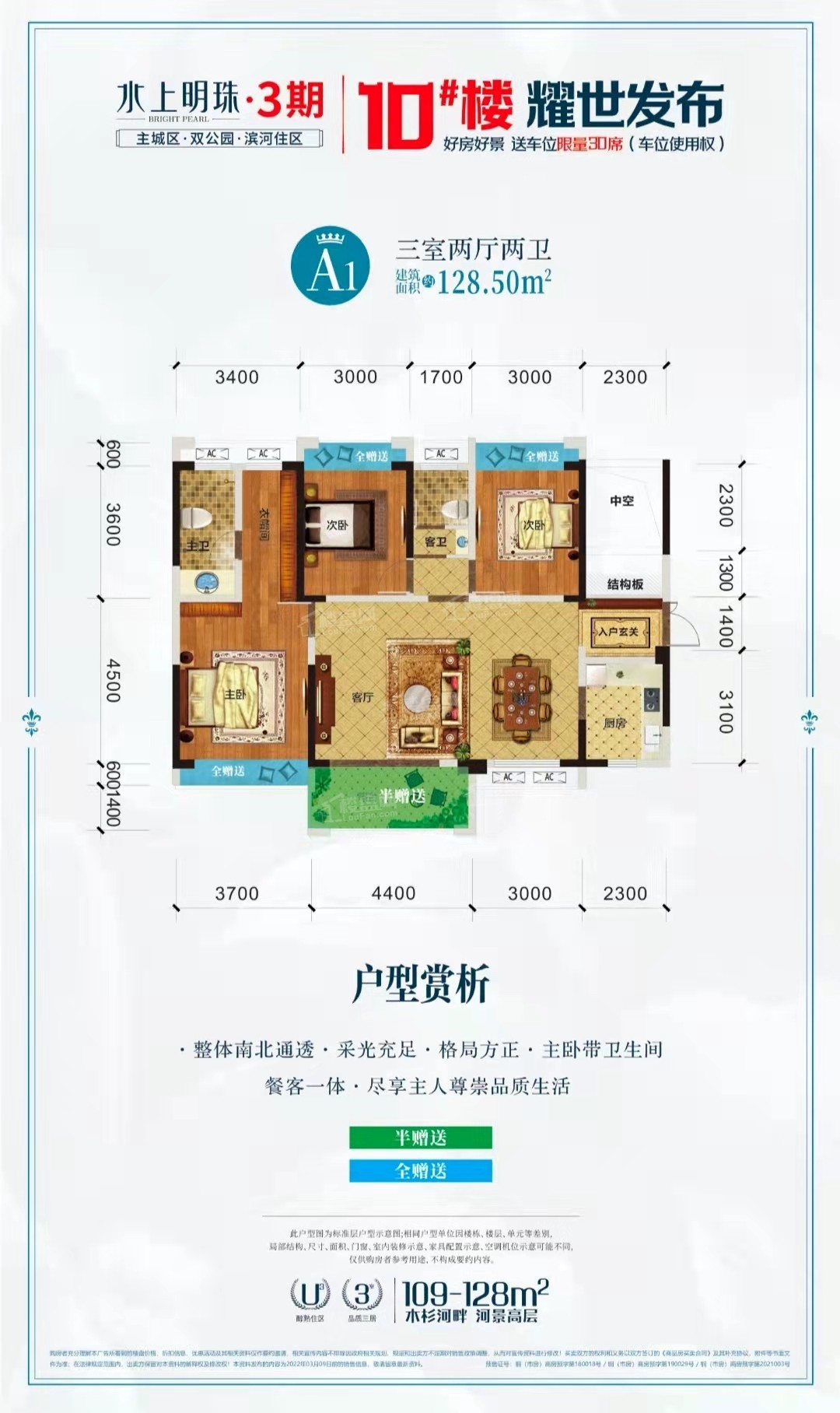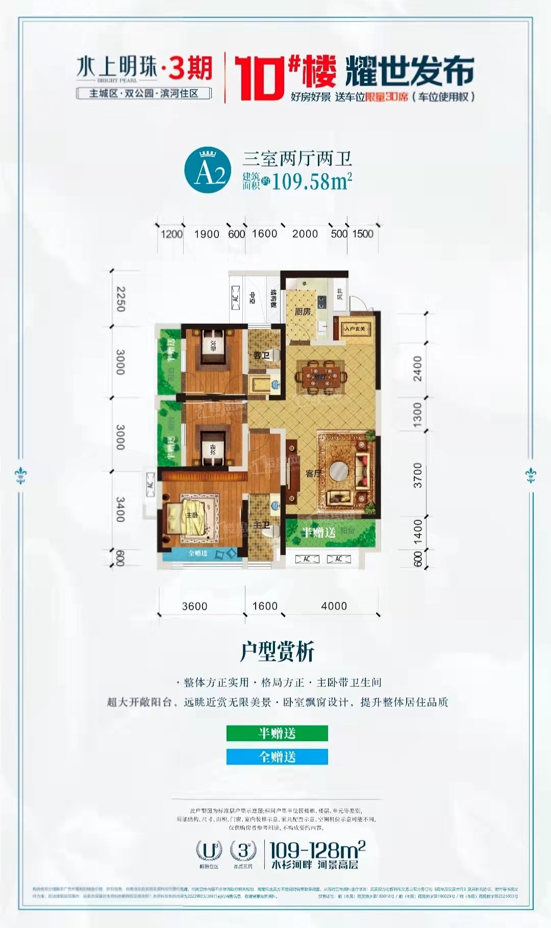 水上明珠共有9个户型,当前有9个户型在售,109.58㎡的3室、141.97㎡的4室、128.50㎡的3室、167.10㎡的4室、118.64-119.54㎡的3室、115.5㎡的3室、134.62㎡的3室、113.51㎡的3室、134.62㎡的3室。其中109.58㎡的3室的A2户型户型特别受欢迎。该户型户型方正,全明格局,动静分区,实用率高深受购房者的喜欢。具体户型情况如下